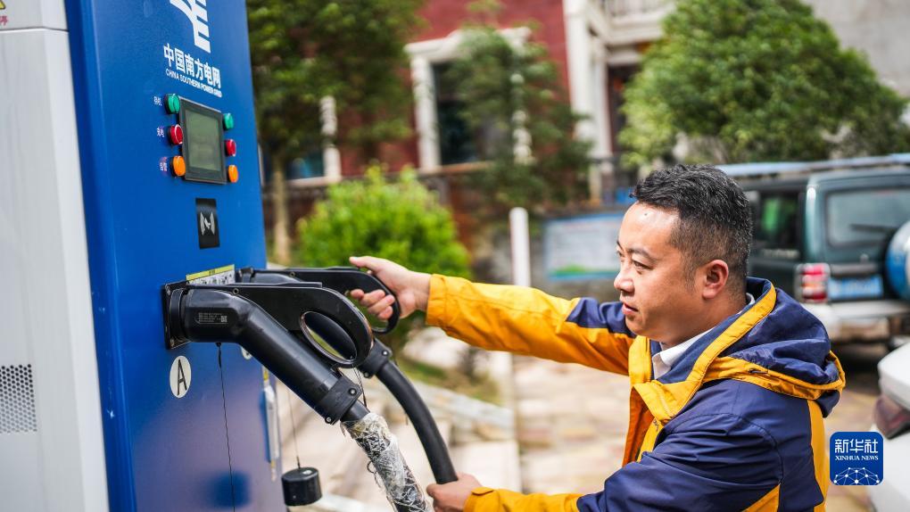 车主在六盘水市钟山区青林苗族彝族乡使用充电桩给新能源汽车充电(9月22日摄)。 新华社记者 陶亮 摄