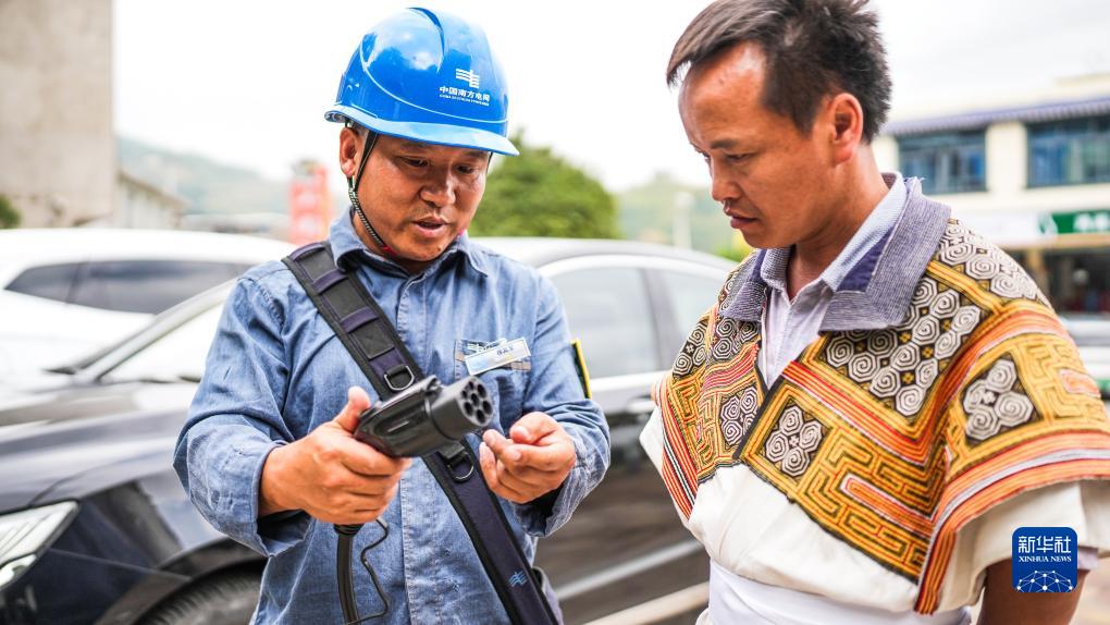 在六盘水市钟山区青林苗族彝族乡灰依村,南方电网六盘水供电局工作人员在指导当地群众如何正确使用充电桩(9月22日摄)。 新华社记者 陶亮 摄