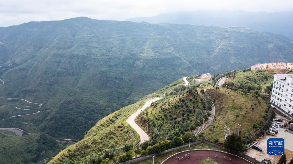 新能源汽车在盘州市乌蒙镇的充电桩设施充电(图右下)(9月21日摄,无人机照片)。 新华社记者 陶亮 摄