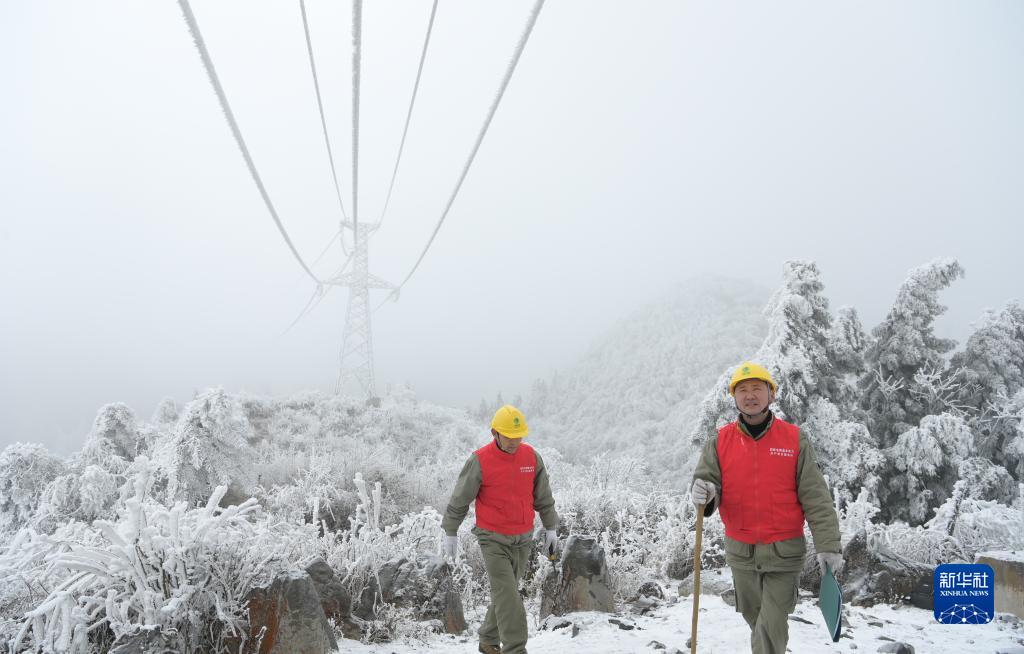 2月27日,在湖北省鹤峰县走马镇,应急抢险人员巡视电力线路。 连日来,受持续冻雨低温天气影响,湖北省恩施土家族苗族自治州鹤峰县高山地区电力设施覆冰积雪严重。当地及时组织应急抢险人员进行除冰雪作业,保障供电线路安全可靠运行。 新华社发(杨顺丕 摄)