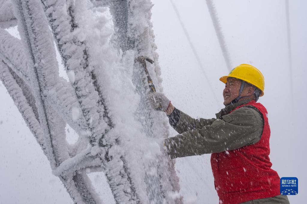 2月27日,在湖北省鹤峰县走马镇,应急抢险人员清除电力铁塔上的冰凌。 新华社发(覃涛 摄)