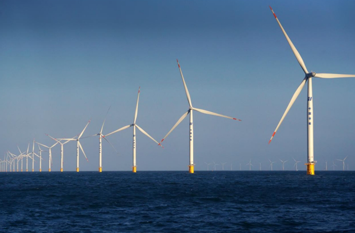 三月中旬,黄海之滨,海风凛冽。从山东海阳港码头出发,海上航行两个半小时后,就看见在蔚蓝辽阔的海天之间,一台台百米高的白色“大风车”列阵迎风旋舞,不远处,白蓝相间印有华能标识的海上升压站分外吸睛。