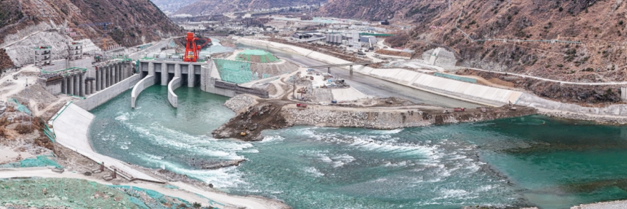 初春的四川甘孜,乍暖还寒。从泸定县城出发,沿大渡河溯流而下,车行大约20公里,一处尚在施工的拦河大坝出现在巍峨群山之间。五孔泄洪闸坝形态初现,面板堆石坝上车来车往填筑正忙,生态流量泄放闸里机器轰鸣,生态厂房封顶在即。