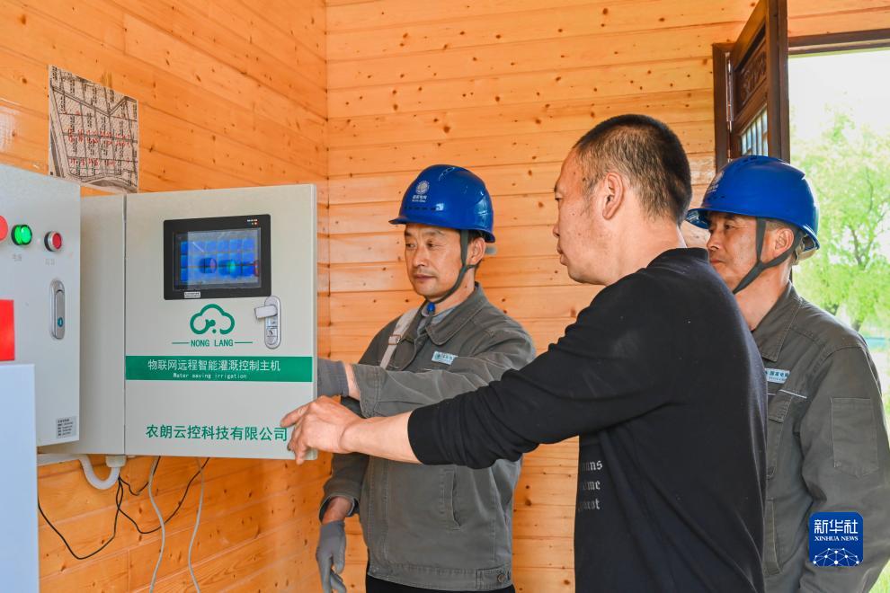 在肥西县丰乐镇新华村,种粮大户唐业银正在工作人员指导下学习使用远程灌溉控制设备的用电。新华社发(刘玲 摄)