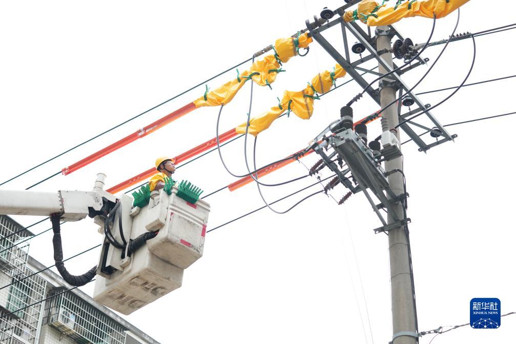 头戴安全帽,身穿绝缘服,登上斗臂车的高空平台进行带电作业。电流穿身过,每一个操作细节必须确保安全、精准。没过多久,贴身的工装便被汗水完全浸湿。