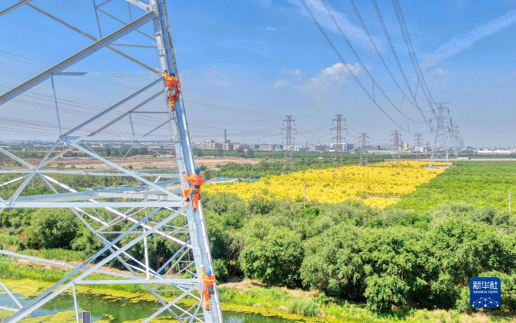 2023年6月20日,国网天津电力工作人员对板桥-滨海500千伏线路工程开展验收工作。(国网天津电力供图)