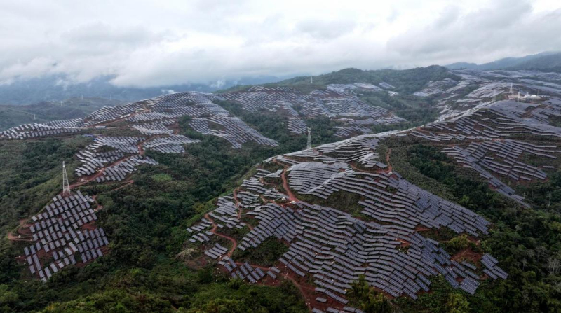 从景洪市驱车近3个半小时,沿蜿蜒山路盘旋而上,就来到了勐腊县易武镇曼腊乡,一排排蓝色光伏板整齐排列在山坡之上,与远处的雨林交相辉映,这里就是华能乌沙河下寨光伏项目现场,也是西双版纳州目前装机容量最大的光伏电站。今年3月,随着该项目全容量并网投产,华能在西双版纳州的新能源项目投产装机容量突破百万千瓦大关,占西双版纳州新投新能源装机总量的93.75%。