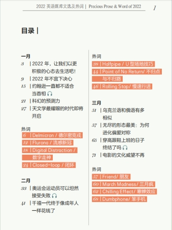 从“年”的维度来看,以《数据助力美好生活:2022英语媒库文选及热词》为例。岁首1月我们号召“2022年,让我们以更积极的心态去生活吧”,北京主办冬奥会的2月有“奥运会运动员可以坦然接受失败”,3月介绍热词March Madness/三月疯,6月关注三星堆出土文物,7月聚焦“气候危机导致热浪和山火”,8月解读“为什么树木认为秋天已经来临”,到年底的12月盘点“2022年热词既古怪又令人沮丧”……时光的脉搏清晰可见。