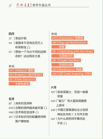 《让我们珍惜当下》《数据助力美好生活》两本书新鲜出炉,至此,参考消息报社“参考年鉴丛书”已出版2019年、2020年、2021年、2022年英语媒库文选(和热词)合集共四本。这套中英对照的图书里都有什么呢?