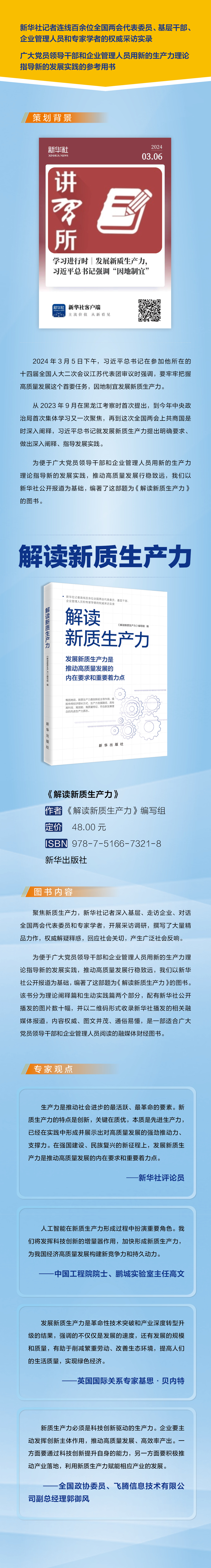 该书以新华社权威报道为基础编纂而成,分为“理论阐释篇”和“生动实践篇”,权威阐释新质生产力的深刻内涵、重大意义,精彩呈现各地区各部门发展新质生产力的生动实践。