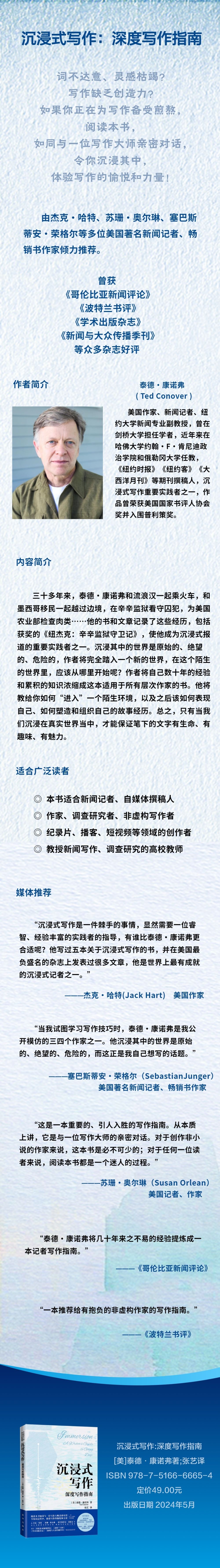 毫无疑问,沉浸式写作是一项艰苦卓越的工作。只有下一番功夫去体验和了解他人的世界和感受,才能保证笔下的文字有生命、有趣味、有魅力,从而令读者感同身受,沉浸其中。好了,现在就让我们一起翻开这本书,跟随作者的脚步,开启一场深度探险之旅,沉浸式体验世间百态吧!