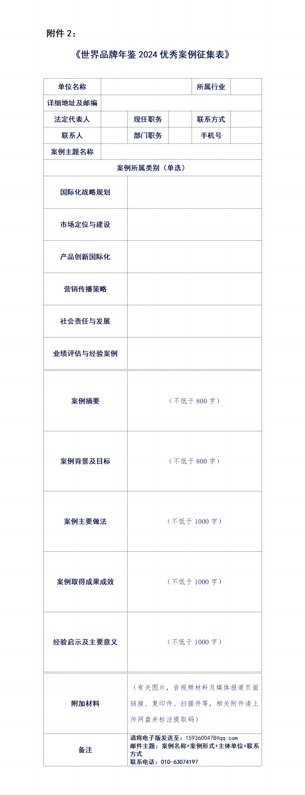 投稿人需填写《世界品牌年鉴2024优秀案例征集表》,并于2024年9月30前,以真实身份按“案例名称+主体单位+联系方式”的格式投送案例至邮箱。