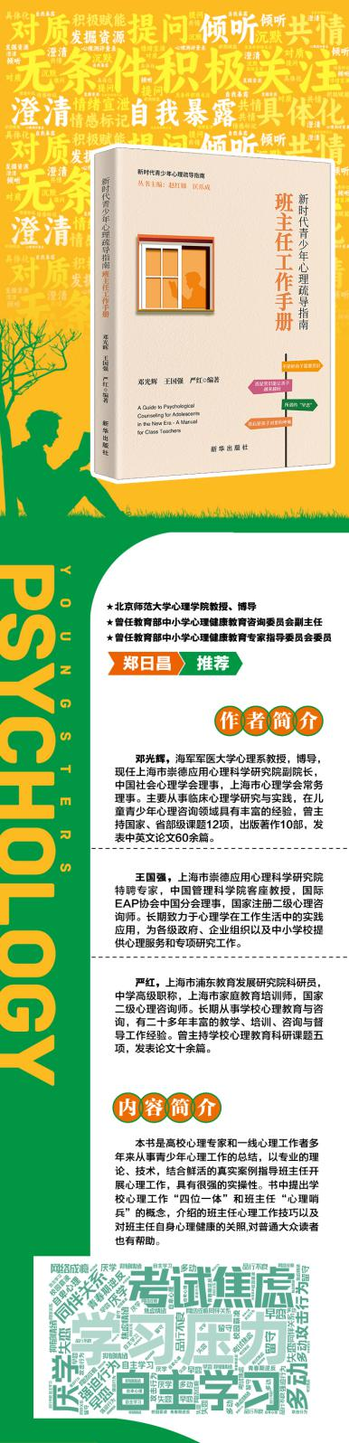 近日,《新时代青少年心理疏导指南:班主任工作手册》由新华出版社正式出版发行。该书是新华出版社和上海市崇德应用心理科学研究院“新时代心理学服务社会”系列图书的首本,是高校心理专家和一线心理工作者多年来从事青少年心理工作的总结,以专业的理论、技术,结合鲜活的真实案例指导班主任开展心理工作,具有很强的实操性,得到包括郑日昌教授在内的国内多位知名心理学家的肯定及推荐。