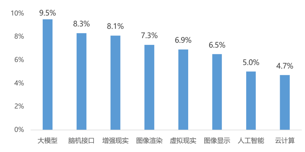 另一方面,在上海加快建设国际科技创新中心的过程中,商用落地场景是关键,游戏产业则提供了一个关键“出口”。近年来,已有多家上海企业在游戏相关领域开展研究并申请专利,2023年大模型、脑机接口、增强现实领域相关专利中分别有9.5%、8.3%、8.1%由上海企业申报,游戏产业的技术价值不断得以凸显。
