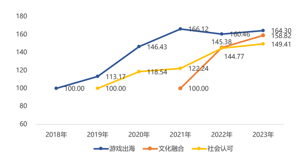 指数结果显示,2023年,社会价值分指数达158.04点,较前一年增长5.01%,呈现平稳上涨态势;其中,文化融合指数同比增长9.25%,是带动社会价值分项上升的主要动力;游戏出海指数在2023年达164.30点,相较2022年增长2.39%,尽管尚未达到2021年的最高值,但整体呈现回升态势。