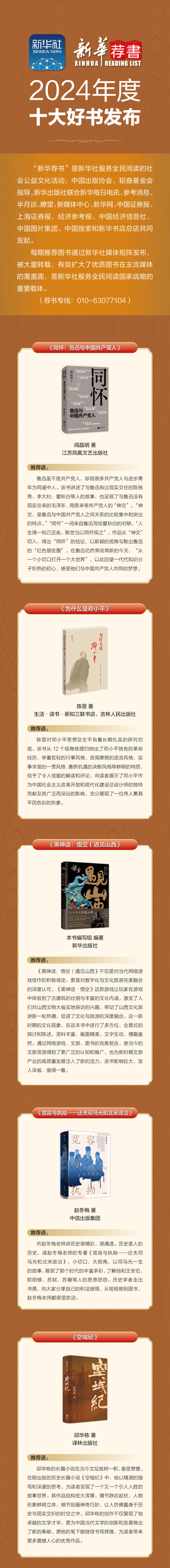 结合网络投票结果,“新华荐书”评审委员会专家对2024年度“新华荐书”推荐图书及各大出版社报送的优秀图书反复评议,最终选出十大好书,在第四届全民阅读大会和第三十个世界读书日来临之际,“新华荐书2024年度十大好书”重磅发布!