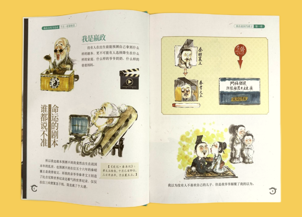 全书采用大16开精装设计,以杂志化版式增强互动感。知名插画团队以水墨风为基底,融入萌系夸张手法——头戴迷你冠冕的Q版秦始皇、泼墨背景下挥剑策马的动态场景,既保留传统艺术韵味,又注入年轻化视觉语言,与精彩的文字相得益彰。