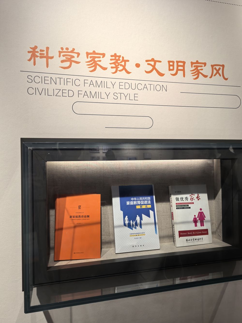 参会嘉宾在扬州市校家社协同育人基地参观“科学家教 文明家风”主题橱窗,新华出版社的图书居于醒目位置。