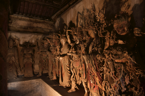 彩塑是原位塑造,还是他处迁移?有人认为,村庙不会有大寺规格的护法神群,二十四诸天是从周边某座大寺院迁移至此;也有人认为,二十四诸天是金大定七年重安佛像时,诸天随之迁移。