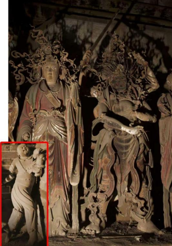 3.三处童子造型的细节呼应。根据北京明代法海寺的鬼子母形象,以及其他的图像资料,我基本能判断出鬼子母一般都是一位母亲和一位童子同时出现的固定搭配。我曾实地测量过,南库房存放的童子身高1米,而与菩提神树对应的女神像右手下垂之态(手残缺)距神台恰好1米,再根据本院看寺50年之久的王改英老人描述,基本可以断定此女神像就是鬼子母。此外,南库房中存放的鬼子母的小孩与背光后观音脚下的善财童子呼应,两者都虎头虎脑、憨态可掬,神态几乎一模一样。泥塑语言一致,系同一手法。