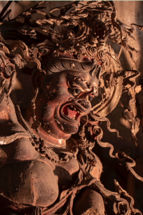 3.南方增长王脚下的那只伏地精怪有蝙蝠状翅膀,该精怪造像的泥胎层极薄且内部未设置木质或铁质骨架作为支撑,整体结构脆弱易碎。这种“薄胎无骨”的塑形方式决定了它不具备异地预制、长途迁移的条件。