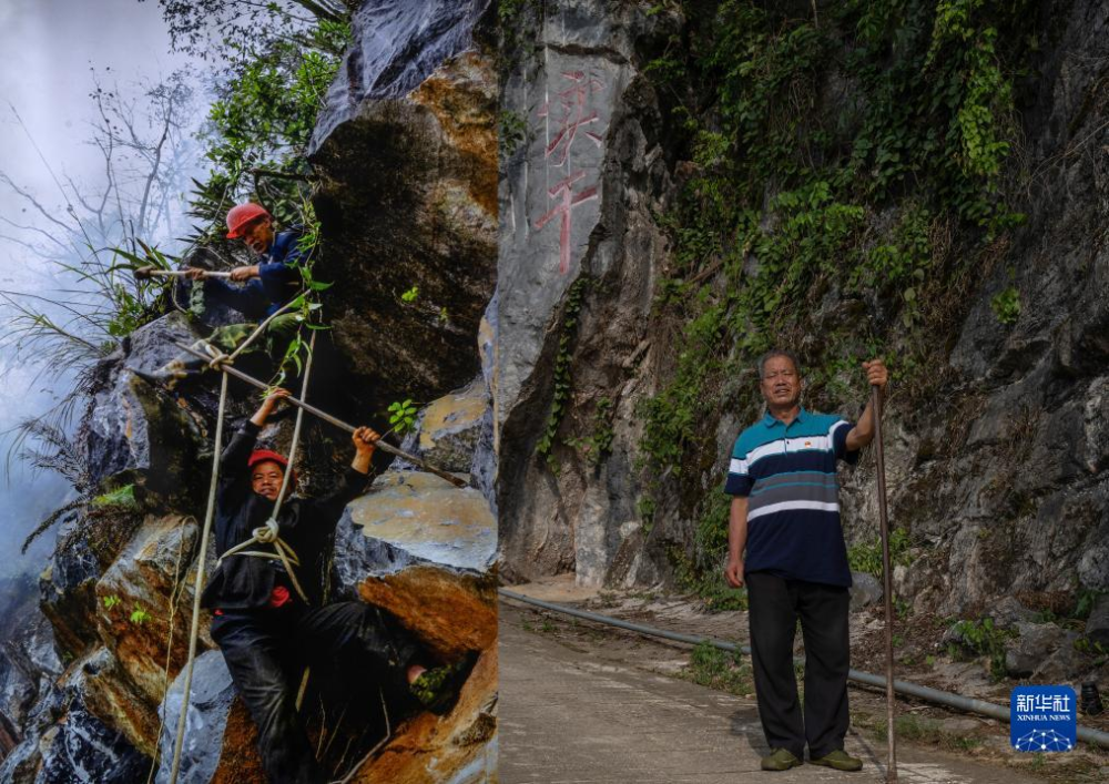 这是一张拼版照片:左图为2008年李华明(下)和同伴在修路时在悬崖上打炮眼的资料照片(西畴县融媒体中心供图);右图为2023年7月26日李华明在修好的出村路上留影(新华社记者 费茂华 摄)。