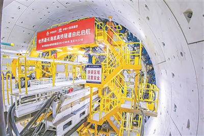 近日,在中铁十四局承建的甬舟铁路金塘海底隧道宁波侧地下64米深处,“甬舟号”盾构机成功穿越海堤,由陆域段进入海域段掘进施工,标志着世界最长海底高铁隧道全面进入穿海之旅。