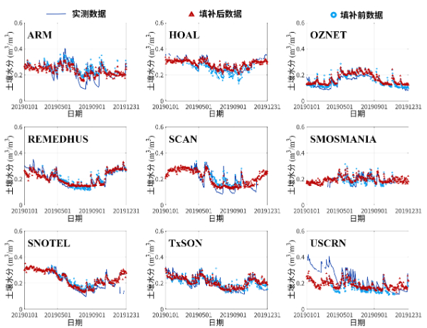 填补前后土壤水分与实测数据在全球不同观测网对比