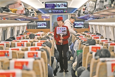 在静音车厢内,列车长杨瑞花手举提示牌进行巡视。 史港泽/视觉中国