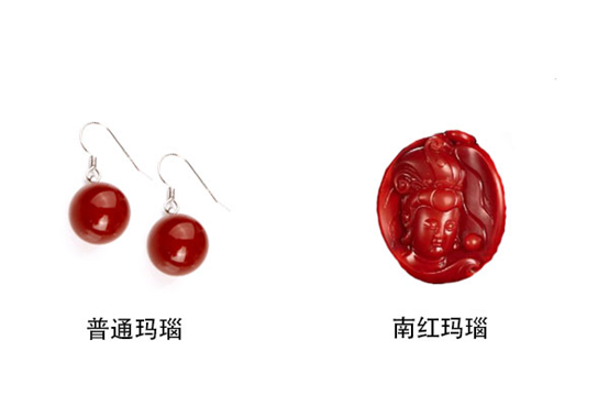 与普通红玛瑙相比,南红玛瑙光泽油润、质地细腻,且呈现出独特的红色。当把南红玛瑙放在强光下观察时,可以看见其中有许多红色的小点(俗称“朱砂点”),而南红玛瑙所呈现的红色就是由这些小点聚集形成的,普通红玛瑙却没有此特征。但一些南红玛瑙颜色相对比较深,强光无法穿透过去,便很难观察到此现象。