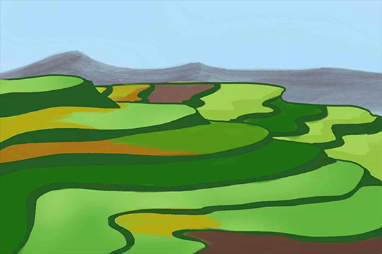 梯田是在坡地上沿等高线修建成台阶式或坡式断面的田地,因为块状田地顺坡按等高线方向排列,外形看起来呈阶梯状而得名。水稻生长需要大面积的水塘,更适合在水资源丰富的平原地区。但我国南方地区的一些省份地形多为丘陵、山地,为解决粮食问题,居住在此地的农民借助堤坝修筑了能够涵养水源、适宜水稻种植的梯田,使得丘陵地区也能够大面积种植水稻。
