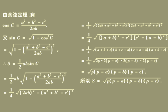 秦九韶算法和海伦公式本质上的原理十分相似,因此用秦九韶算法来推导海伦公式对于数学学习者来说其实并不难。证明过程如下: