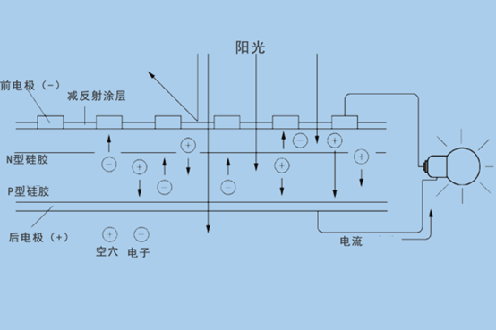 接着电子、空穴相互运动,N区的空穴向P区运动,P区的电子向N区运动。这样太阳电池的受光面有大量负电荷(电子)积累,而在电池的背光面有大量正电荷(空穴)积累。若在电池两端接上负载,负载上就有电流通过,当光线一直照射时,将会有源源不断地有电流流过。