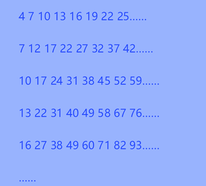 这个表的特点有两个,一是第一行和第一列的数字排法相同;二是,第一行相邻两个数的差是3,第二行相邻两个数的差是5,第三行相邻两个数的差是7,以后以此类推相差9、11、13.....