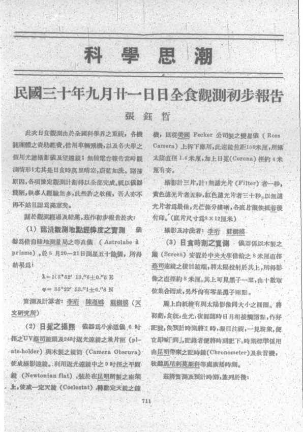 1941年9月21日,一次罕见的日全食带进入我国,这是四百年难得一遇的天文奇观,将吸引全世界的科学家来华观测。但日食覆盖大部分地区位于战火纷飞的抗日战场,各国大多取消计划。时任凤凰山天文台研究所所长张钰哲在仪器被日军炸毁、沿途屡遭敌军袭击的情况下,坚持赴甘肃临洮观测,在抗战最艰苦的时期完成了此次具有特殊意义的日食观测。图为张钰哲所做观测报告(局部)。