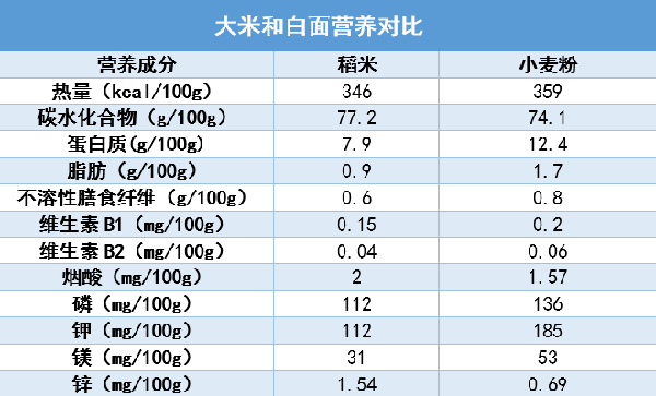 米和面最主要的任务就是提供碳水化合物和热量,在这一点上二者不相上下。在蛋白质含量上,面粉要比大米高一些,但二者蛋白质的质量都不如肉蛋奶更容易被人体吸收利用。在膳食纤维含量上,小麦的不溶性膳食纤维原本是稻米的18倍,但被加工变成小麦粉之后会大大流失,仅剩下0.8克/100克,和大米的含量差不多。至于其他维生素、矿物质等营养成分的含量,两者相差不大。