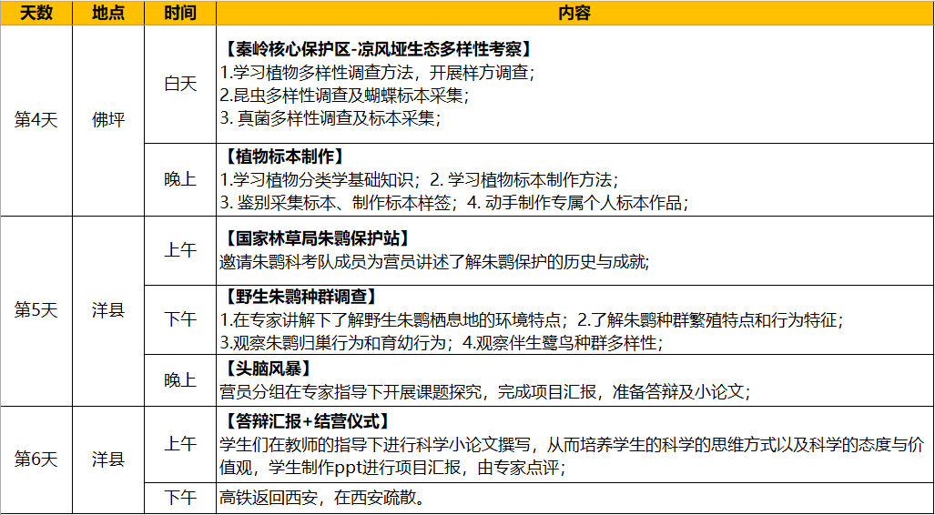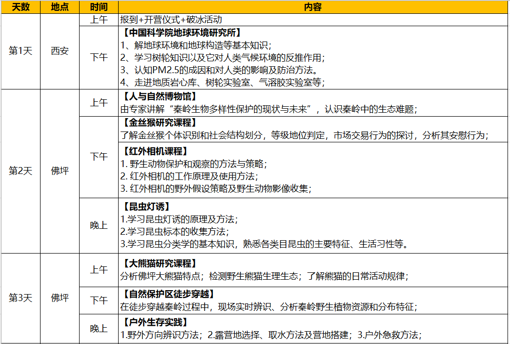 在专家带领下徒步穿越秦岭山脉,现场辨识、分析秦岭野生植物资源与分布特征;分析佛坪大熊猫特点、观测野生熊猫生理生态,了解熊猫日常活动规律;了解金丝猴个体识别和社会结构划分,分析种群习性;走进国家重点实验室,参观前沿科学技术成果;掌握野外生存基本技能,增强动手实践和团队协作能力等。