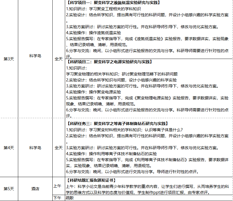走进科学岛,一次性接触六大国家顶尖科学成果;特邀国家大科学装置科学家全程带领学生完成三大科研实验,撰写专业实验报告;分享青年科学家科研道路选择与规划,感受榜样力量;全面了解人造太阳研究的意义和价值,思考“人类终级能源”的意义;掌握文献研究的方法,完成科学实践调研报告;走进国家重点实验室,掌握科研规范,深度参与实验设计,完成相关科研实验。