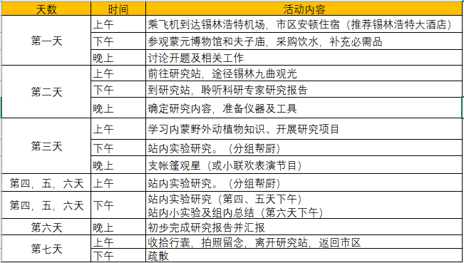 在科学家和一线科学老师的带领下,走进野外科考台站,全面了解当地草原环境;领取科学调查任务,通过观察草原现象,实施动植物调查研究;基于项目式科学探究,深度参与放牧生态植被修复、昆虫与植被相互作用、草原鸟类生存策略等项目式研究,完成不同类型的科研任务;掌握基本的科学探究方法,提升创新思维与科研实践能力。