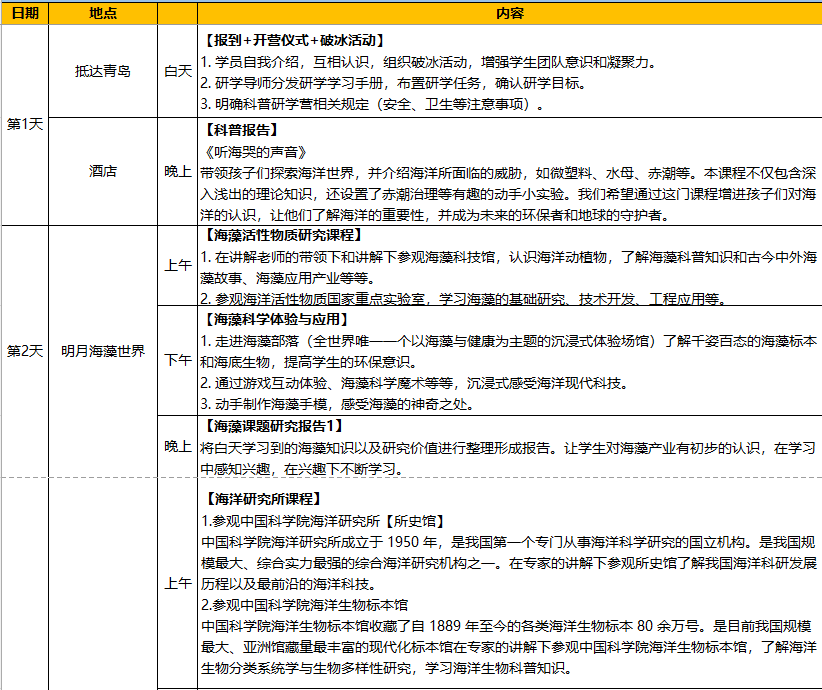在科学家的带领下,登上海洋科学考察船,深入了解大型海洋科考设备,体验科学家海上科考环境,了解最前沿的海洋探测技术;与科学家面对面交流,走进海洋的微观世界;走进全球唯一一个以海藻为主题的沉浸式体验馆,动手制作海藻手模,感受海藻的神奇魅力;走进亚洲馆藏量最大的海洋生物标本馆,近距离观察各种珍稀海洋生物;夜间追寻“蓝眼泪”踪迹,全面了解夜光藻及其背后的生物、生态学知识。