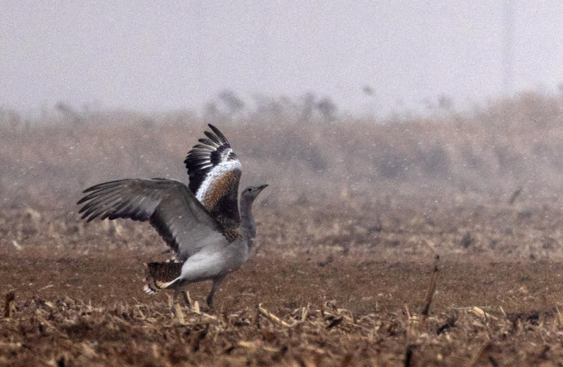 与我们常见的“轻盈”的鸟类不同,大鸨更像浅棕色的“鸵鸟”。大鸨是世界上最大的飞行鸟类之一,雄鸟体长可达1米,体重10公斤,雌鸟比雄鸟相对要小得多,平均体重3.5公斤,因此大鸨还是世界上雄鸟和雌鸟体重相差最大的鸟类。由于体重大,起飞很费劲,所以大鸨对接近的威胁特别敏感,如果人出现在500米距离范围内,大鸨就会提高警惕,靠近到200米距离内就会惊飞。