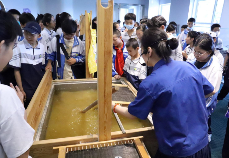 恒丰纸业造纸博物馆(黑龙江)讲解员在科普体验活动中讲解手工纸的抄造过程