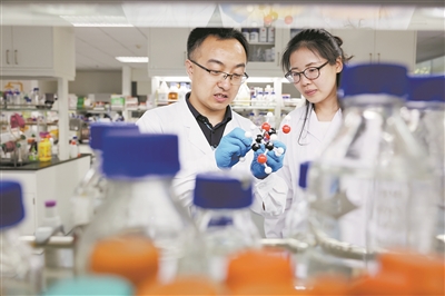 在中国科学院天津工业生物技术研究所实验室,该所副研究员杨建刚(左)和同事在讨论工作进展。