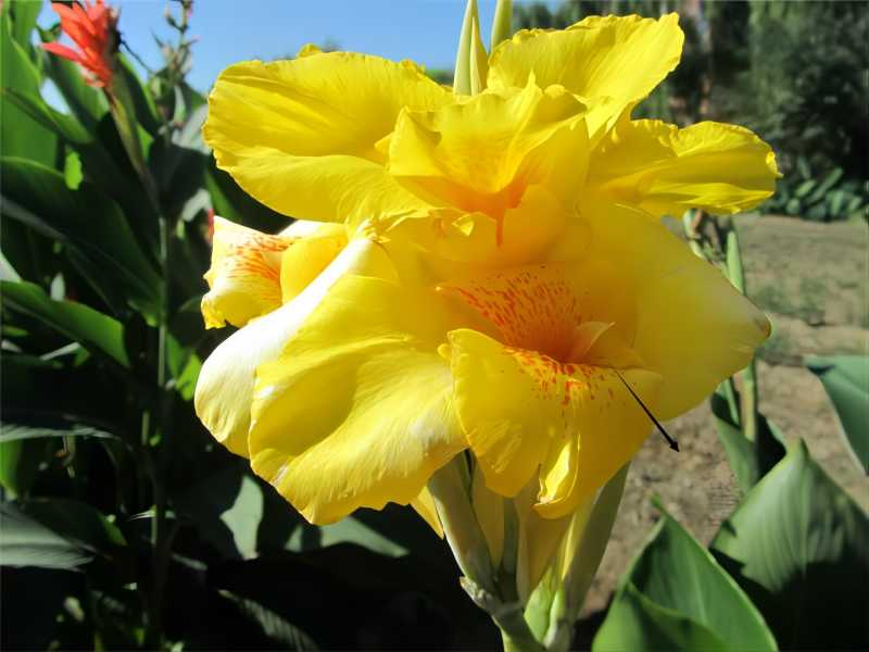 美人蕉直直的“茎干”其实是由多个叶鞘紧密排列而形成的假茎,将本属于柔弱草本的株型托举得高大壮硕,大部分品种都可以长到2米左右。它那大大的叶片形似芭蕉,全身光滑,又被有蜡质的白粉,一眼望去油绿发亮,种在北方庭院里极富热带风情。