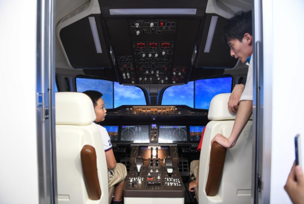 9月17日,全国科普日主场活动展区小朋友体验C919模拟驾驶器。(资料图片)