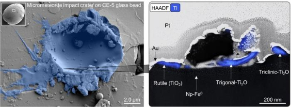 月壤微陨石撞击坑中的钛纳米矿物示意图(左图为假彩色图,蓝色区域为撞击溅射物)。(中国科学院地球化学研究所供图)