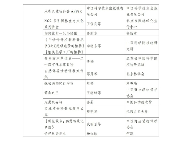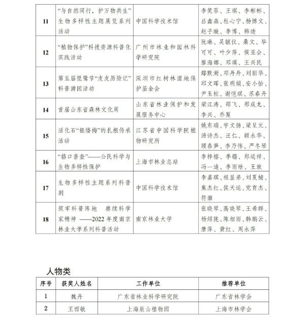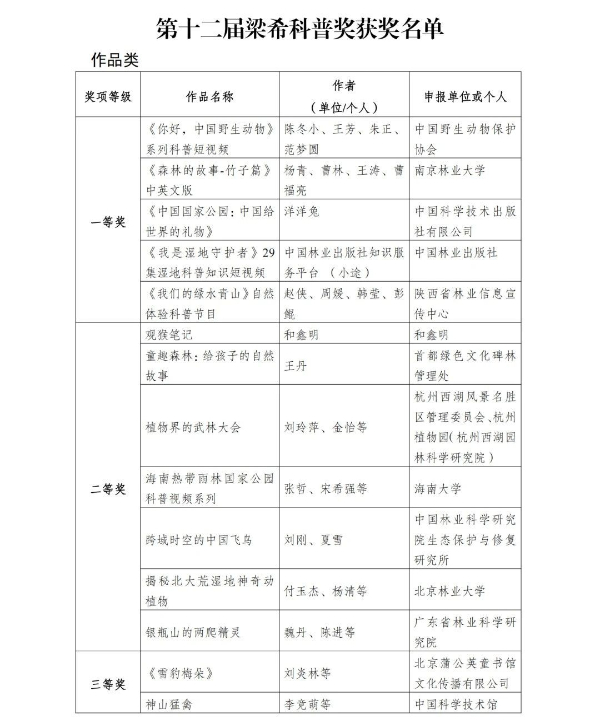 中国林学会于2023年8月启动了第十二届梁希科普奖评选工作。评选期间,共收到149项符合相关要求的申报材料,包括科普作品类75项、科普活动类47项、科普人物类27项。