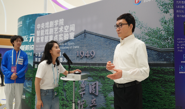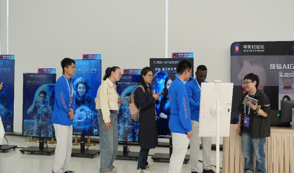 图为4月25日拍摄的中关村国际创新中心现场,观众与工作人员正在体验“AIGC海报数字人”互动项目。