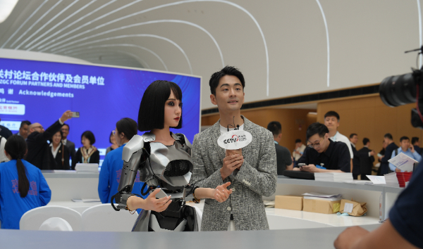图为4月25日,媒体、观众与中关村国际创新中心里的仿生人形机器人互动。