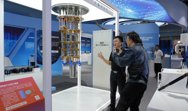 图为4月25日拍摄的工作人员正向观众介绍量子云算力集群。
